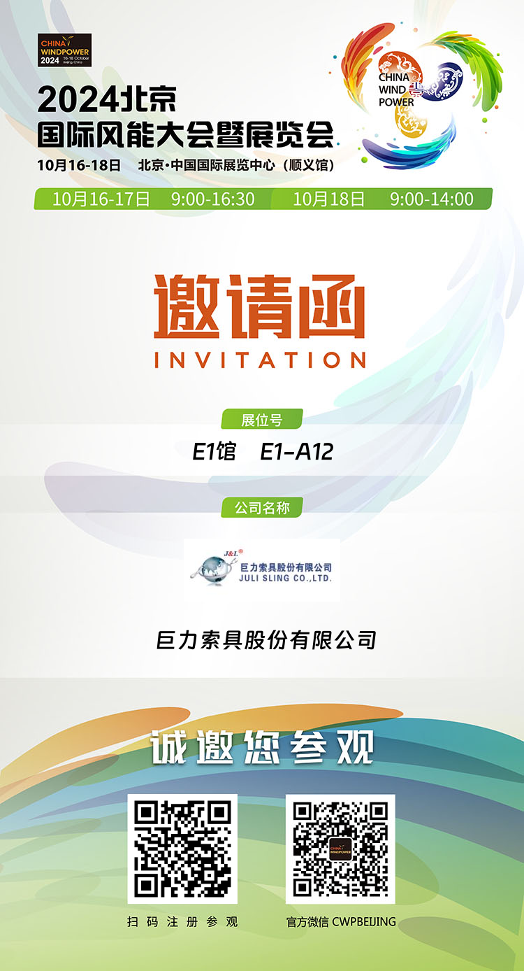 在展會上,巨力索具將以高強度、耐腐蝕的索具材料,智能化、自動化吊裝系統,全方位展示如何助力風能項目降本增效,推動行業綠色發展。我們誠邀您蒞臨展會現場,與我們共同見證這一行業盛會!