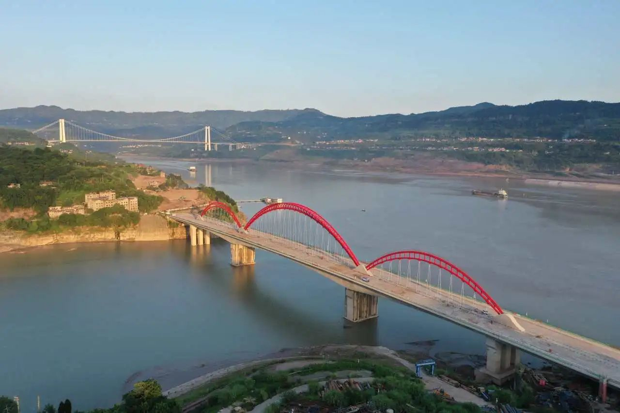 青山綠水之間,一座大橋騰空而起,不僅方便了當地人民交通出行,促進經濟發展,而且在川渝大地,長江之側形成了一道亮麗的風景線,兼具美學和實用價值。